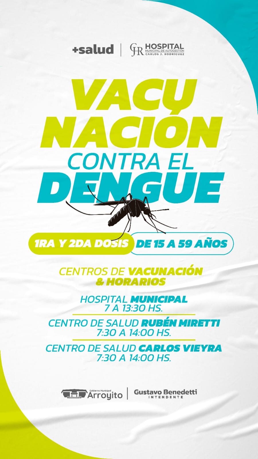El Gobierno Municipal de la ciudad de Arroyito, informó que continúa la campaña de vacunación contra el dengue, destinada a personas de 15 a 59 años, tanto para primera como para segunda dosis.