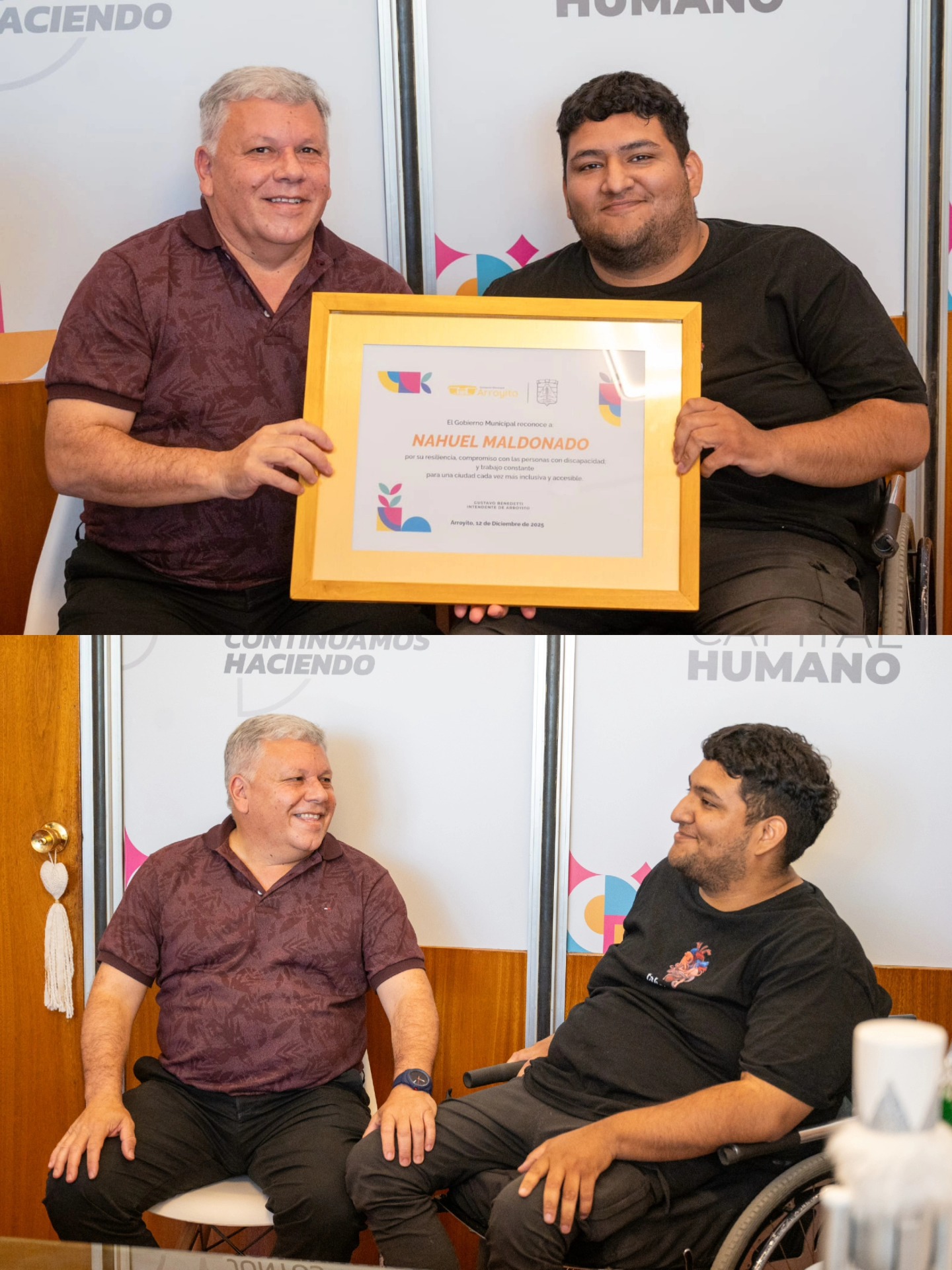 El intendente de Arroyito, Gustavo Benedetti, reconoció a Nahuel Maldonado como vecino destacado y le entregó una Declaración de Interés Municipal por su trabajo en la visibilización de la discapacidad y la promoción de una ciudad más inclusiva.