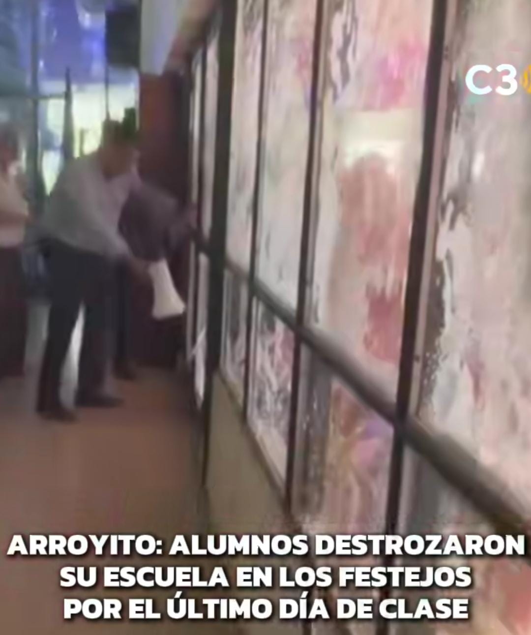 Un grupo de alumnos que celebraba su último día de clases habría provocado daños en el Colegio Vélez Sarsfield de la ciudad de Arroyito. Los estudiantes se habrían reunido previamente en la costanera del río y luego habrían intentado ingresar por la fuerza al edificio escolar.