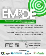 El próximo 20 de noviembre, a las 19:30, el Auditorio Municipal José de San Martín será escenario de una jornada especial dedicada al espíritu emprendedor. Bajo el nombre “La Puerta Emprende”, el encuentro promete inspirar, conectar y potenciar ideas con historias que nacen desde el interior provincial.